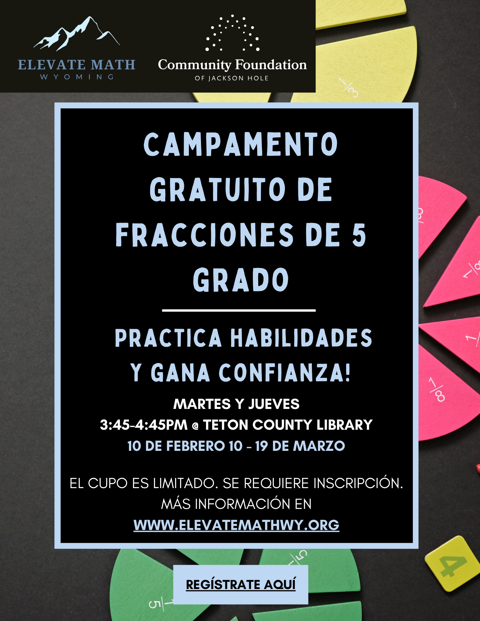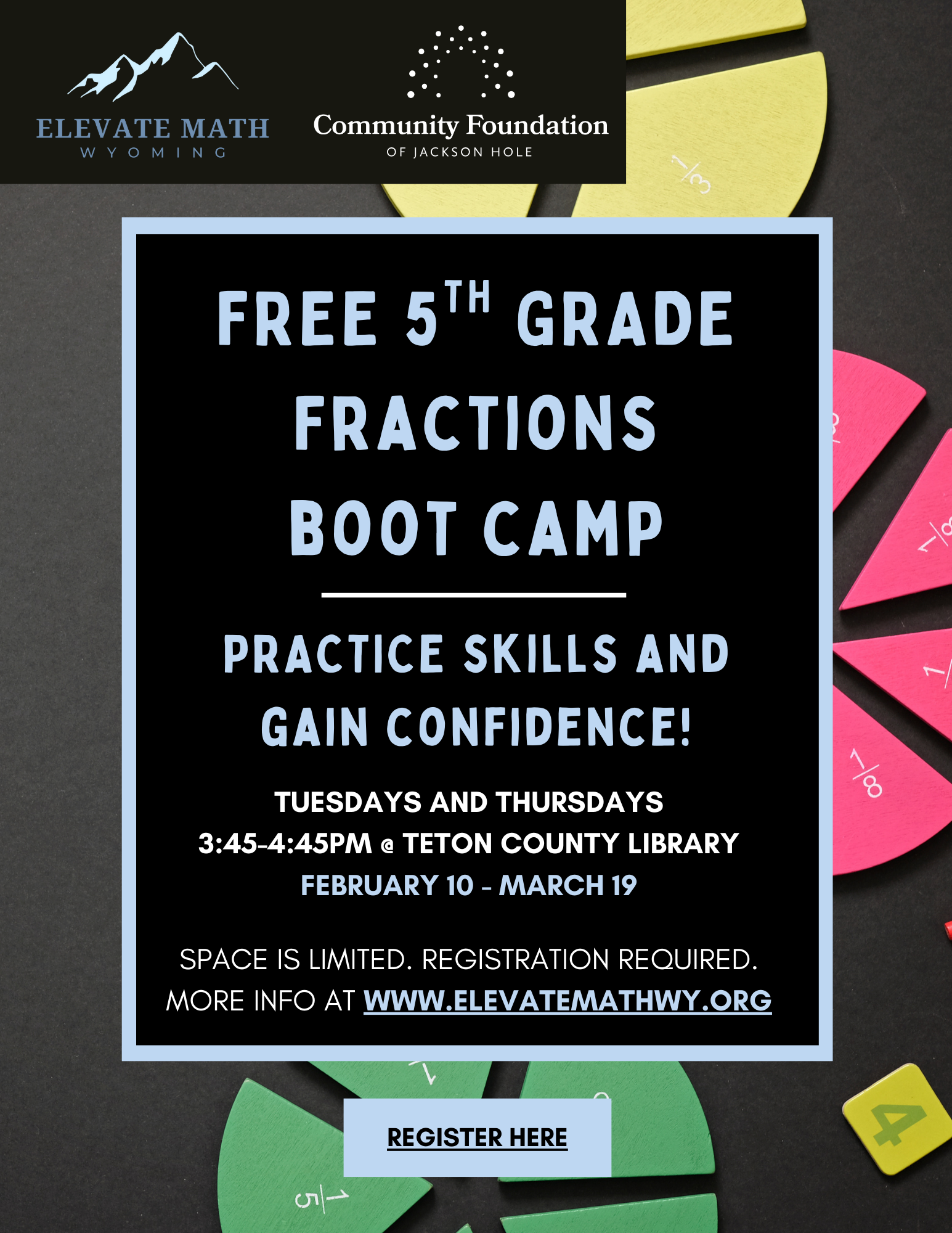 Elevate Math Wyoming is excited to host a free, fractions “boot camp” for TCSD 5th grade students needing additional support to practice fraction skills and build confidence. Mastery of fractions leads the way into confidence with algebra, setting students up for long-term success in mathematics.